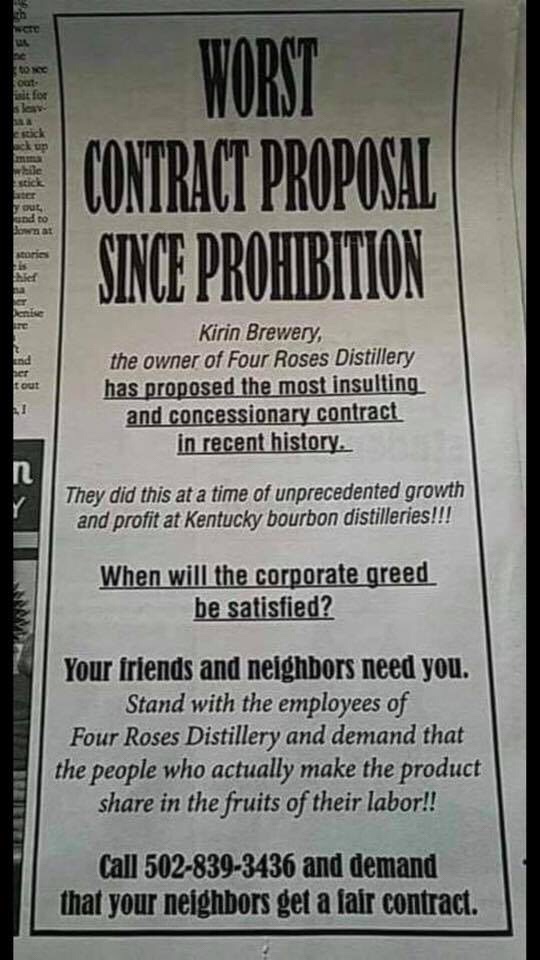 Three unions including UFCW Local 10D, UFCW Local 23D and NCFO 320 went on strike today at the Four Roses Bourbon distillery in Lawrenceburg, KY. An estimated 53 workers are picketing after failed negotiations concerning increased benefits.
