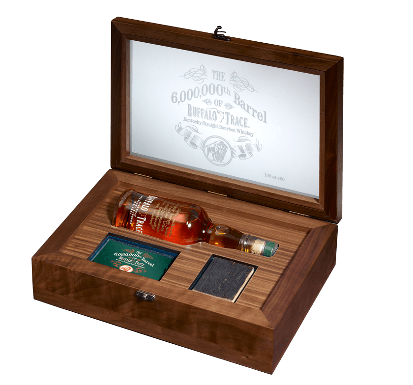 The six millionth barrel bottles of Buffalo Trace Kentucky Straight Bourbon Whiskey are aged 10 years, 11 months and are packaged in a numbered collector’s edition hardwood showcase box that includes a piece of the charred oak stave from the historic barrel and small brochure explaining the significance of this collector’s edition. The bottles are 375ml and have a handwritten description on the bottle explaining the significance.