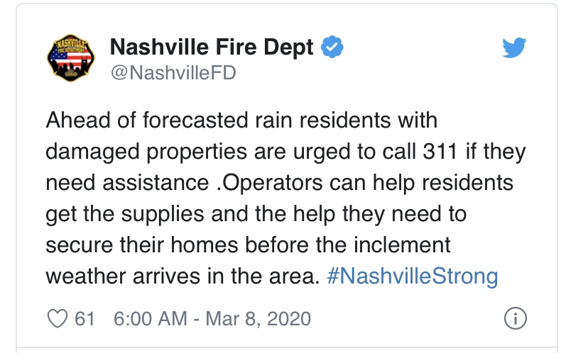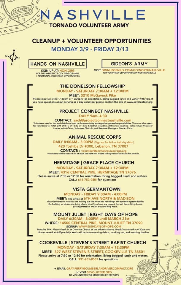 Hands On Nashville- working closely with the City of Nashville and the Office of Emergency Management to safely deploy volunteers to areas in need of help. Sign up here.